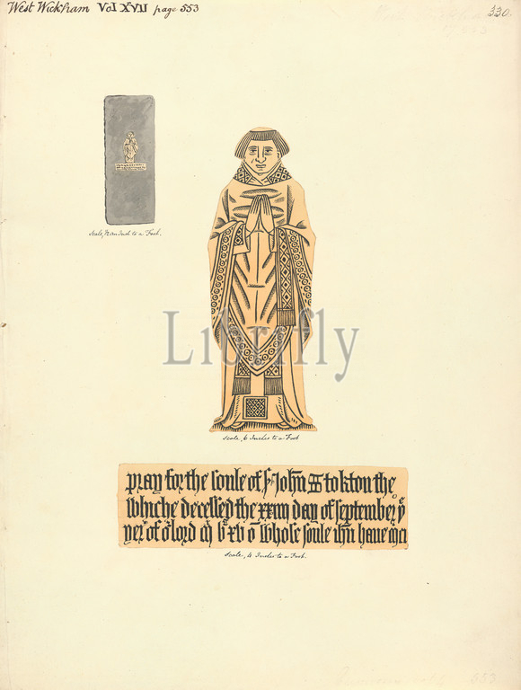 Brass Plate Monument, John Stockton, West Wickham Church, Daniel Lysons, 1762–1834, British, 1796, 1811, Graphite, watercolor, pen, black ink, medium, slightly textured, cream wove paper, Sheet, architectural subject, historical subject, praying, England, Europe, London, United Kingdom