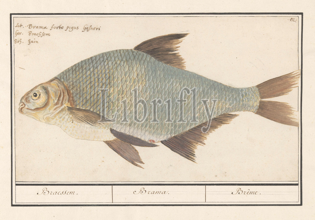 Bream, Abramis brama, Braessem, Brama, Brême, title, object, Numbered top right, 12, Top left, name, three languages, Part, sixth album, drawings, fish, shells, insects, Sixth, twelve albums, animals, birds, plants, 1600, commissioned, Emperor Rudolf II, explanation, Dutch, Latin, French, bony fishes, NAME, Anselmus Boetius de Boodt, 1596, 1610, paper, pencil, chalk, watercolor, paint, deck paint, ink, pen