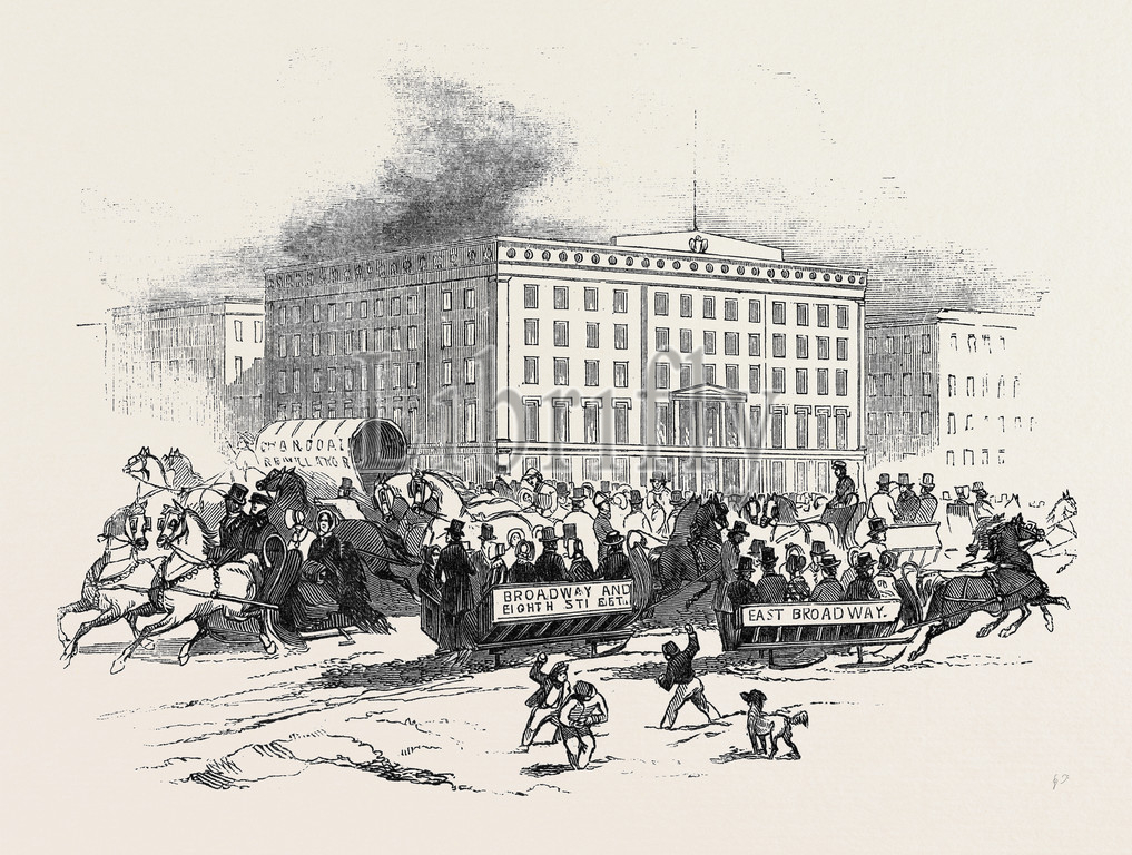 broadway, new york, sleigh, riding, late, sw, storm, us, America, United States, uk, animal, mammal, equestrian, equine, horse, 1845 engraving, engraved image, history, illustrative technique, engravement, victorian, arts, culture, retro styled, vintage, retro, arkheia
