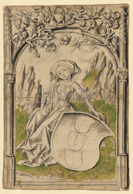 Broken glass with sign accompanist and coat of arms of the Basel Guild of Heaven, c. 1470/80, feather in black, brush in gray and black, over preliminary drawing with black pencil, watercolored with green and in places with yellow, sheet: 42.6, 43.4 x 29.4 cm, verso inscribed:, The other highborn, Anonym, Oberrhein (Basel), um 1470/80