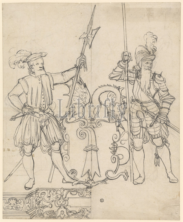 Broken glass, two warriors, Basel coat, arms, feather, brush?, dark gray, preliminary drawing, black pencil, sheet, 44 x 36 cm, marked, Hans Brand, Basel 1552–1577/78, Basel