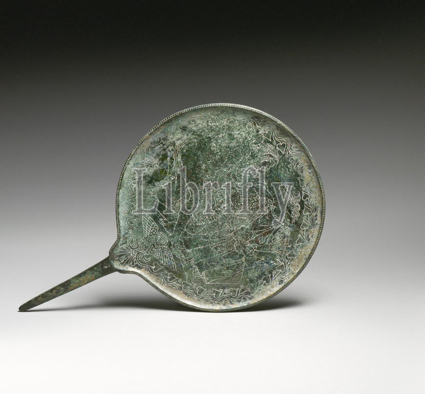 Bronze mirror, Classical, ca, 425–400 B.C, Etruscan, Bronze, 9 9/16 x 6in, 24.3 15.3cm, Bronzes, Satyr, maenad, motif, satyr chasing maenad, popular erotic, subjects, Greek art, composition, circular, reminder, frequent appearance, interiors, cups