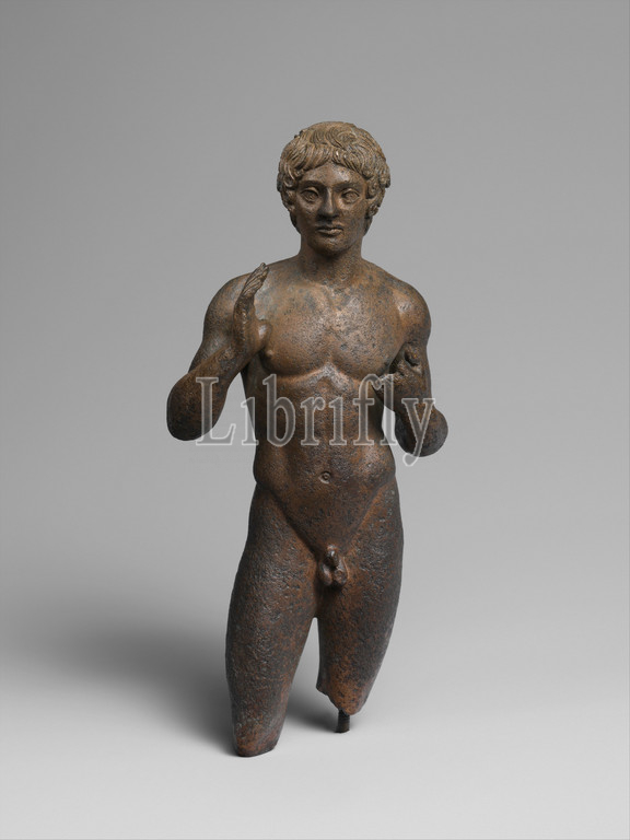 Bronze statuette, youth, Classical, late 5th century B.C, Etruscan, Bronze, H, 7, 17.8 cm, Bronzes, exquisite, statue, depicts, nude young, man, hands raised, ancient prayer, gesture, facial features, hair, musculature, precisely, accurately modeled, stance, even, hairstyle, long wavy, locks, parted, center owe, Greek sculptures, Polykleitos, Doryphoros, Diadoumenos, copies, display, galleries