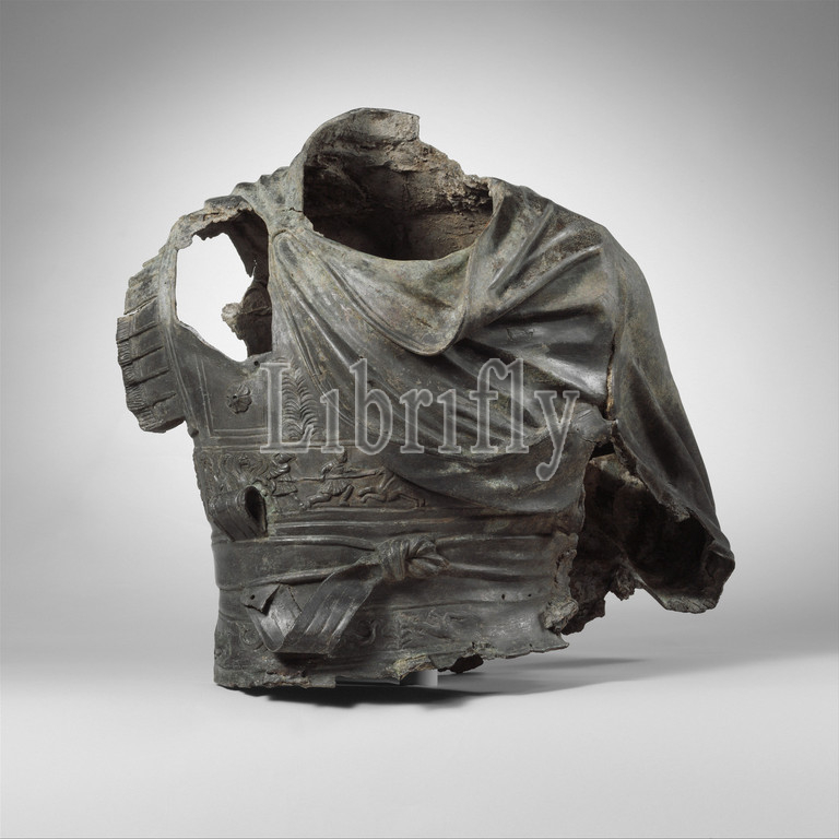 Bronze torso, equestrian statue wearing, cuirass, Hellenistic, Imperial, 2nd century B.C.–2nd .D, Greek, Roman, bronze, H, 25, 63.5 cm, Bronzes, pose, fragmentary, figure, wears, short cape, ornate cuirass, Hellenistic type, originally riding, rearing horse, left hand, holding, reins, right wielded, weapon