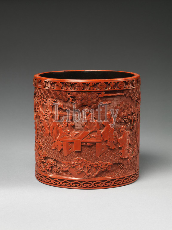 清乾隆 剔紅庭園人物圖筆筒, Brush holder with scholars in a garden, Qing dynasty (1644–1911), Qianlong period (1736–95), 18th century, China, Carved red lacquer, H. 6 1/2 in. (16.5 cm); Diam. 6 3/4 in. (17.1 cm), Lacquer, This brush pot shows scholars writing, painting, and enjoying nature—a form of imagery found throughout Chinese art. While resonating with individual activities, the scene also recalls famous historical gatherings such as those in the West Garden, an eleventh-century imperial family residence