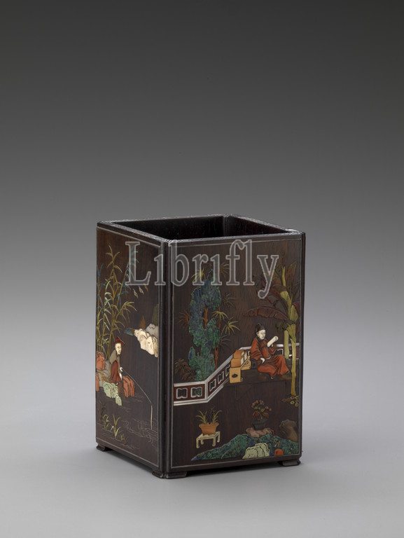 brushpot with scenes of country pursuits, Qing dynasty, Qing dynasty, about 1700, various inlays in zitan wood, 5-3/8 x 3-5/8 x 3-5/8 in., Asian Art