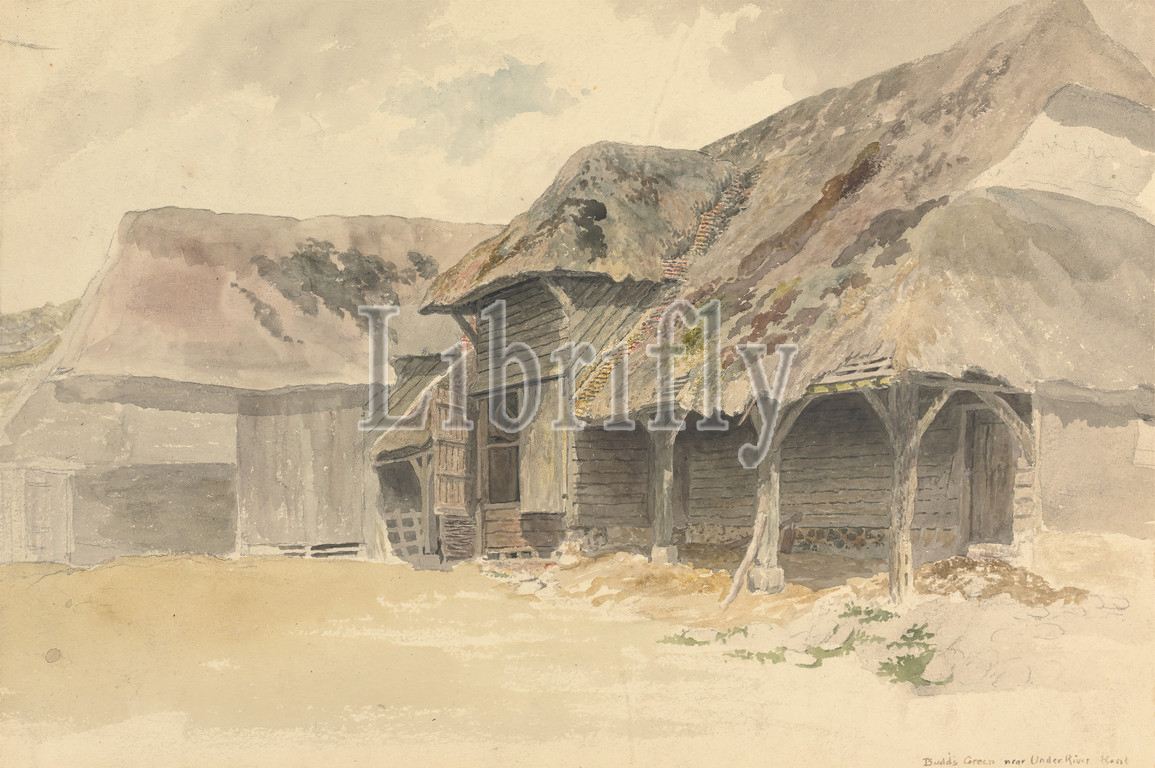 Budds Green, Kent, Robert Hills, 1769–1844, British, undated, Watercolor and graphite on moderately thick, slightly textured, cream wove paper, Sheet: 8 1/8 x 12 1/4 inches (20.6 x 31.1 cm), architectural subject, beams, house, roofs, thatched, England, Europe, Kent, United Kingdom