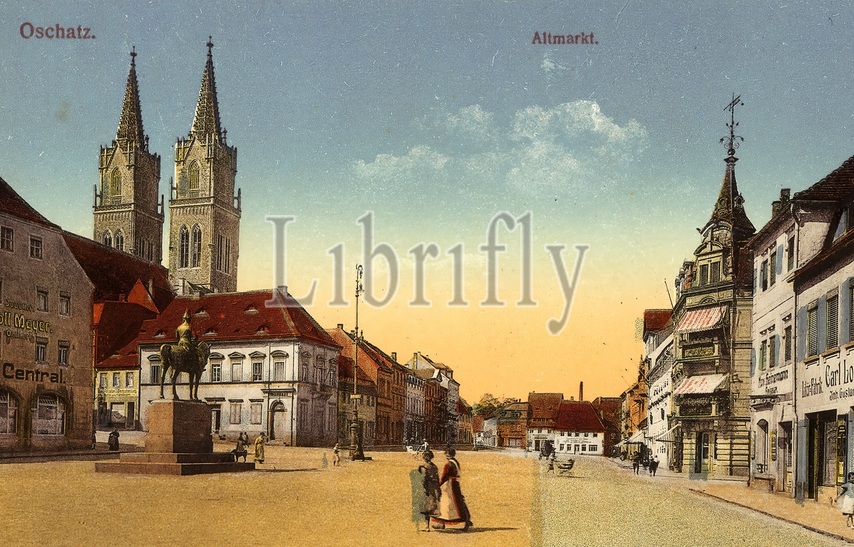 Buildings in Oschatz, Churches in Oschatz, Altmarkt (Oschatz), Equestrian statue of Albert of Saxony, Oschatz, Shops in Saxony, 1915, Landkreis Nordsachsen, Altmarkt, Germany