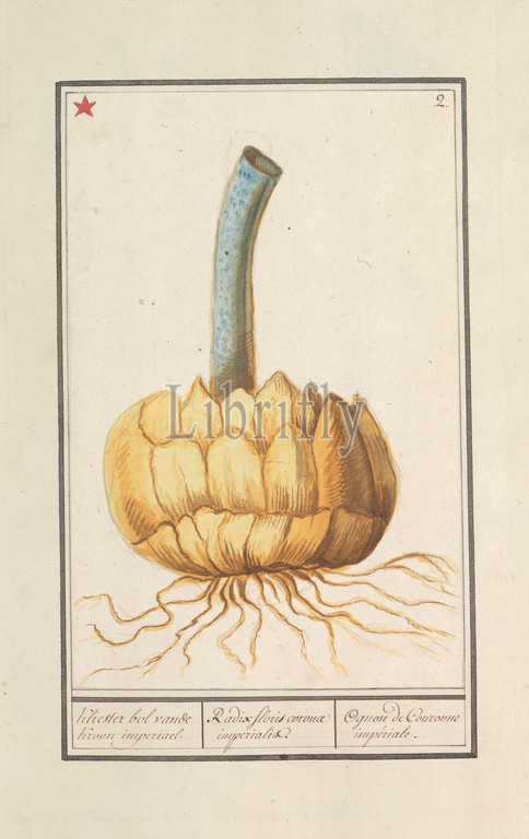 Bulb, Imperial Crown, Fritillaria imperialis, Kliester globe, Crown imperial, Radix floris coronae imperialis, Ognon de Couronne impériale, title, object, sphere, imperial crown, Numbered top right, 2, Top left marked, red star, Part, first album, drawings, flowers, plants, Eighth, twelve albums, animals, birds, 1600, commissioned, Emperor Rudolf II, explanations, Dutch, Latin, French, Southern Netherlands, 1796, 1814, paper, watercolor, paint, deck paint, chalk, brush