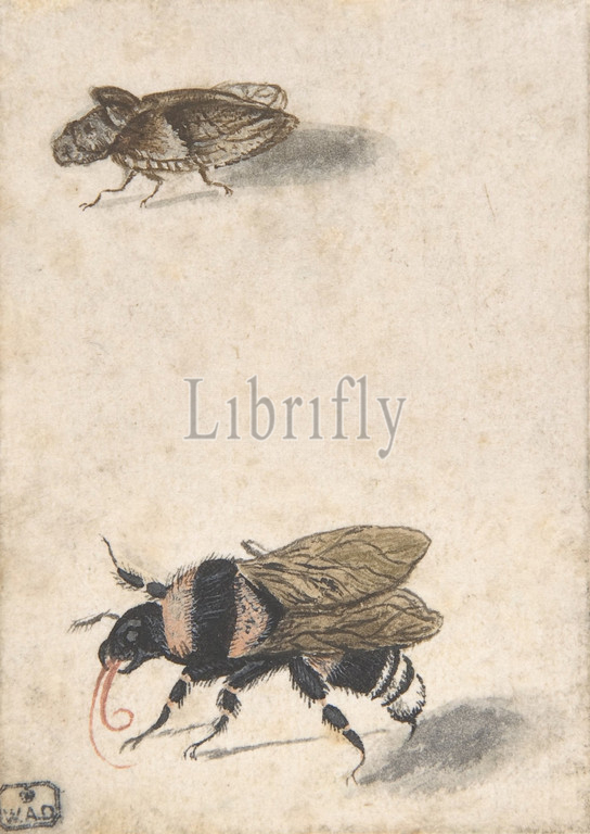 A Bumble Bee and a Fulgoroid, 17th century (?), Pen and black ink, gray wash, gouache, and watercolor, sheet: 3 5/16 x 2 5/16 in. (8.4 x 5.9 cm), Drawings, Anonymous, Dutch, 17th century ?