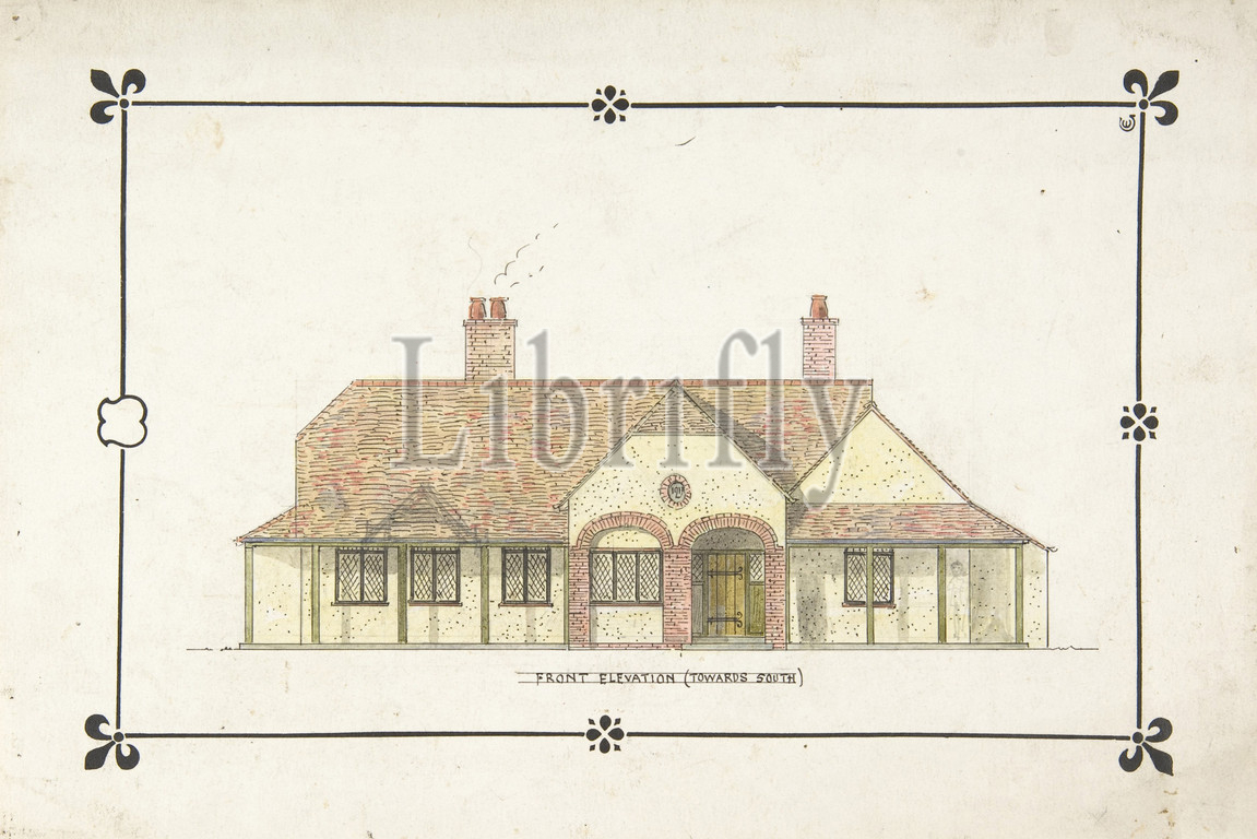 Bungalow drawing, Front Elevation, 1911, Watercolor, pen, black ink, graphite, sheet, 8 1/16 x 11 15/16, 20.5 30.3 cm, Ernest Geldart, British, London, 1848–1929