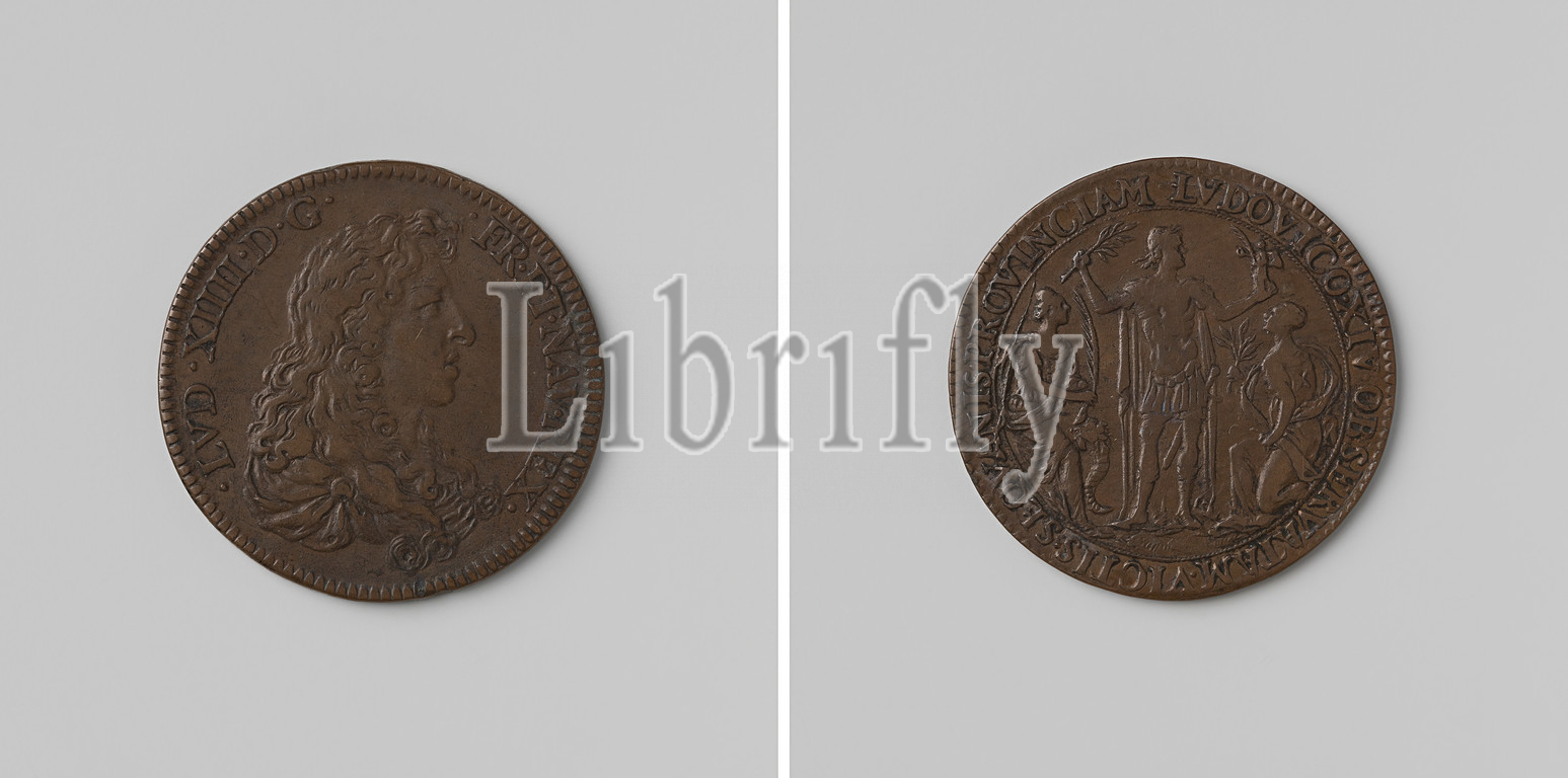 Burgundy taken again by the French, bribe token honored by Louis XIV, King of France, Copper Medal. Front: man's bust to the right within the inscription. Reverse: Louis XIV in Roman clothing holds laurel branch in raised right and victory statue in raised left hand, left: woman with horn of abundance and palm branch, depicting Abundance, right: woman with laurel branch, depicting Victory within a cover, Burgundy, Louis XIV (King of France), anonymous, France, 1674, copper (metal), striking (metalworking), d 2.7 cm × w 6.63 gr