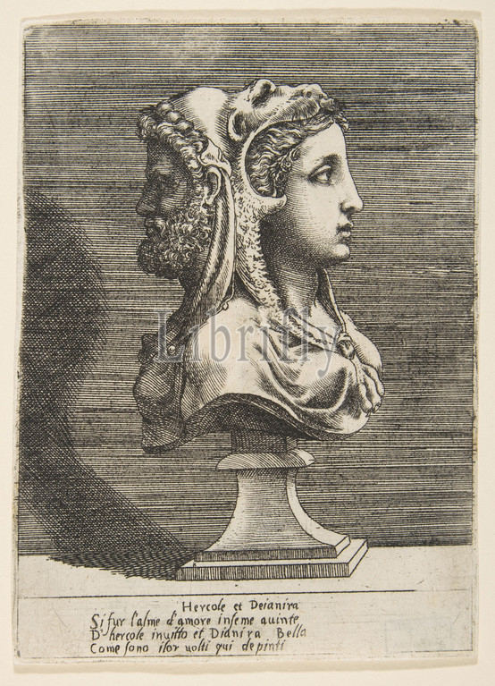 Bust of Hercules and Dejanira, ca. 1531–76, Engraving, sheet: 6 1/16 x 4 7/16 in. (15.4 x 11.2 cm), Prints, Giulio Bonasone (Italian, active Rome and Bologna, 1531–after 1576)