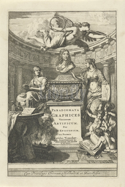 Bust, Jan de Bisschop flanked, allegorical figures Title page, J, de Bisschop, Paradigmata graphices variorum artificum, 17XX, sculpted bust, draftsman, printmaker Jan de Bisschop stands, antique sarcophagus, flies, trumpet blowing Faam, eternity symbol, a snake, bites, own tail, left, bust, personification, history, Historia, writing spring, open book, hands, right, personified drawing holds, drawing, feet putti study, book, sculpture, Fame, Fama, Fama buona, Fama chiara, Ripa, symbolic representations, allegories, emblems, cupids, amores, amoretti, putti, Jan de Bisschop, Gerard de Lairesse, mentioned, object, Amsterdam, 1670, 1725, 1747, paper, etching