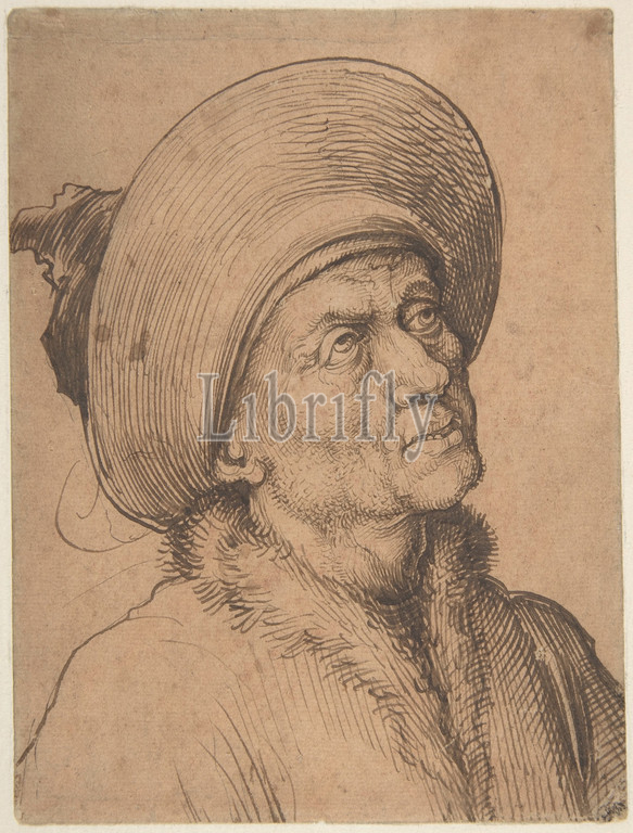 Bust, Man, Hat Gazing Upward, ca, 1480–90, Pen, carbon black ink, pen, brown, paper prepared, sanguine wash, 5 1/8 x 3 7/8, 13 9.6 cm, Drawings, Martin Schongauer, German, Colmar ca., 1435/50–1491, Breisach, Famous even, lifetime, shaped, revitalized German, art, integrating, achievements, great Netherlandish, masters, elevated, engraving technique, pinnacle, perfection, surpassed, Albrecht Dürer, Schongauer, gifted panel, painter, draftsman