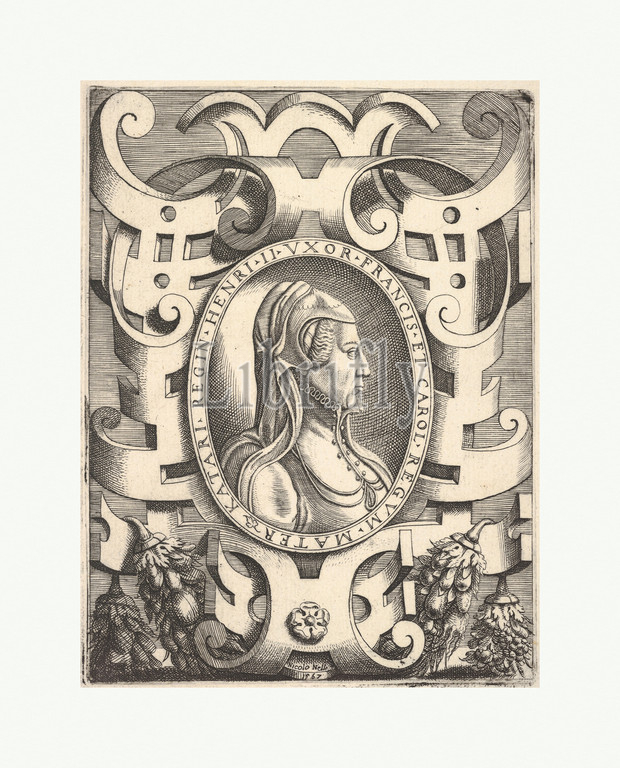 Bust profile portrait, Catherine de, Medici, ornamented frame, Portraits, princes, illustrious people, Ritratti di alcuni prencipi, et huomini illustri, titled, Imagines quorundam principum et illustrium virorum, published, Bolognino Zaltieri, Venice, 1568, 1567, Engraving, plate, 6 15/16 x 5 3/16, 17.6 13.2 cm, Nicolò Nelli, Italian, active Venice, ca., 1552–79