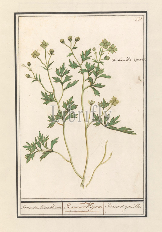 Buttercup, Ranunculus, Variety, buttercup, Ranunculi palustris Species, Bacinet genoille, title, object, four-leaf, five-leaf, Numbered top right, 137, Top right, Latin name, Part, second album, drawings, flowers, plants, Ninth, twelve albums, animals, birds, 1600, commissioned, Emperor Rudolf II, explanation, Dutch, Latin, French, Anselmus Boetius de Boodt, 1596, 1610, paper, watercolor, paint, deck paint, ink, chalk, pen