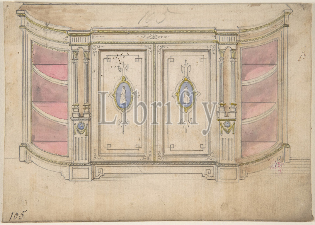 Cabinet Design with Doors Adorned with Porcelain Plaques, 19th century, Ink and watercolor, sheet: 4 15/16 x 6 15/16 in. (12.5 x 17.6 cm), Anonymous, British, 19th century
