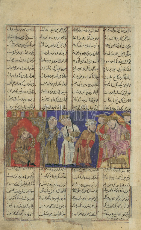 Caesar Gives, Daughter Katayun, Gushtasp, Folio, Shahnama, Book, Kings, Firdausi, ca, 1330–40, Attributed, Iran, Isfahan, Ink, opaque watercolor, gold, silver, paper, Painting, H, 1 15/16, 4.9 cm, Codices, court, Rum, Roman Empire, customary, princess, select, husband, assembled nobles, Katayun chose Gushtasp, whom, dream, father Caesar, dismayed, realizing, actually, Persian prince, traveling incognito
