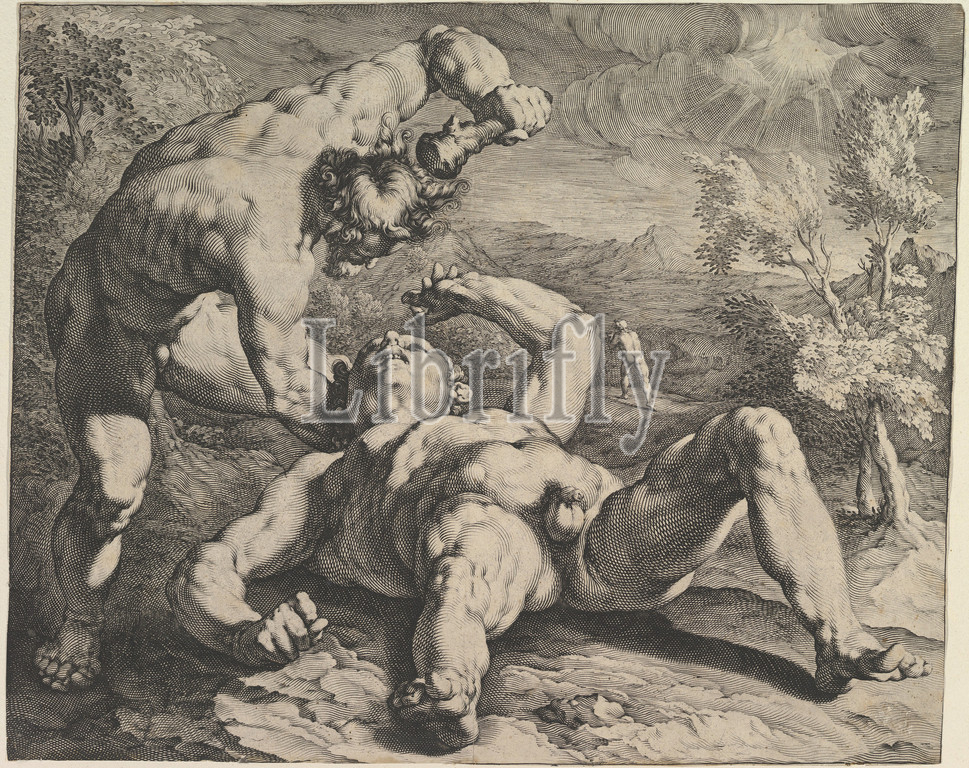 Cain Killing Abel, ca. 1591, Engraving, 33.3 x 41.5 cm, Prints, Cornelis Cornelisz van Haarlem (Netherlandish, Haarlem 1562–1638 Haarlem), Jan Muller (Netherlandish, Amsterdam 1571–1628 Amsterdam)