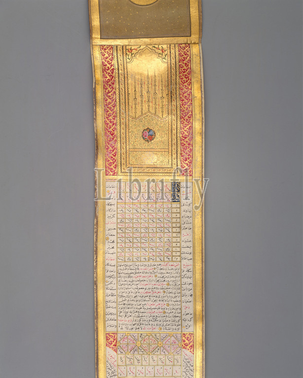 Calendar-Almanac, Scroll Form, dated .H, 1224/.D, 1810, Attributed, Turkey, Ink, opaque watercolor, gold, parchment, H, 4, 10.2 cm, Codices, small, illuminated, handscroll, functioned, portable calendar-almanac, ruznama, diverse contents, include, texts, describing, stations, sun, moon, musical modes, Muslim calendar, times, prayer, different seasons, Christian, sunrise, sunset— arranged, according, position, Istanbul, owner, assumed, lived