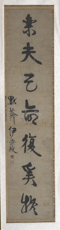 Calligraphy couplet, Yi Bingshou, Calligrapher (Chinese, 1754-1815), Qing dynasty, 1800, ink on paper, 55-7/8 x 12-5/8 in., Signed: Moan Yi Bingshou, Seal, red intaglio: Yi Bingshou yin Seal, red relief: moqing Inscribed: 1903 [colophon probably by Zheng Xiaoxu, 1860-1938, signature removed by Irving's brother, Learn from ancient teachings, there's your reward; Rejoice in heaven's mandate: what else is there to question?], Asian Art