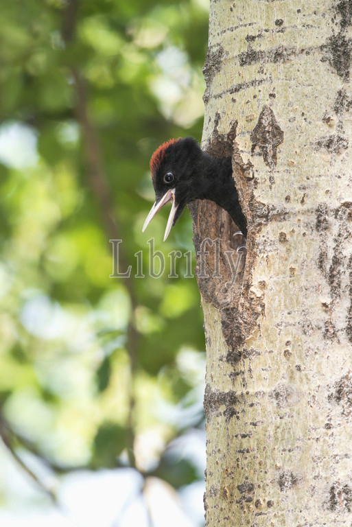 Calling Black Woodpecker chick, nest, Dryocopus martius, Italy, nature, bird, animal, wildlife, wild, fauna, natural, feather, sky, beak, wing, outdoor, freedom, colourful, Liszt, Natural History, ornithology, vertebrate animals, photography, color image