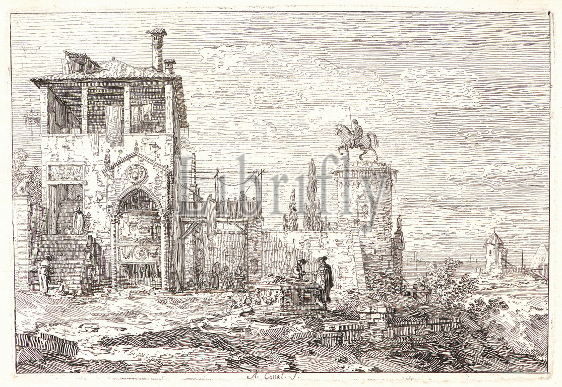 Canaletto (aka Antonio Canale) (Italian, 1697 - 1768). Landscape with an Equestrian Statue (Paysage avec une Statue Equestre), ca. 1741-1745. Etching.
