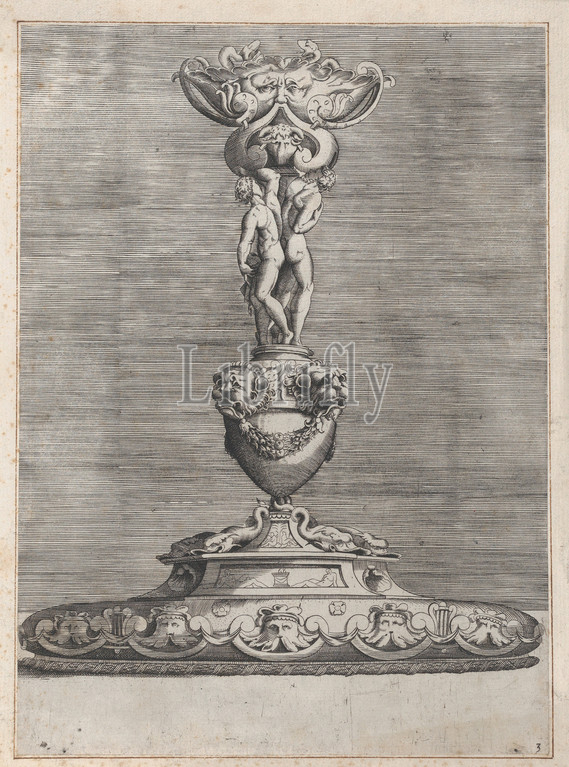 Candlestick, Two Ignudi, Top, Vase, Lion Heads, 1552, Engraving, first edition, Sheet, 9 1/2, 6 15/16, 24.2, 17.7 cm, cropped within plate marks, sides, Anonymous, Italian, 16th century, possibly, after Enea Vico, Parma, 1523–1567, Ferrara, or vice versa, Design, candlestick, two ignudi, back, supporting, basin, standing, top, vase, decorated, masks, shape, lion, heads, foot, nautical theme, doplhins, harps