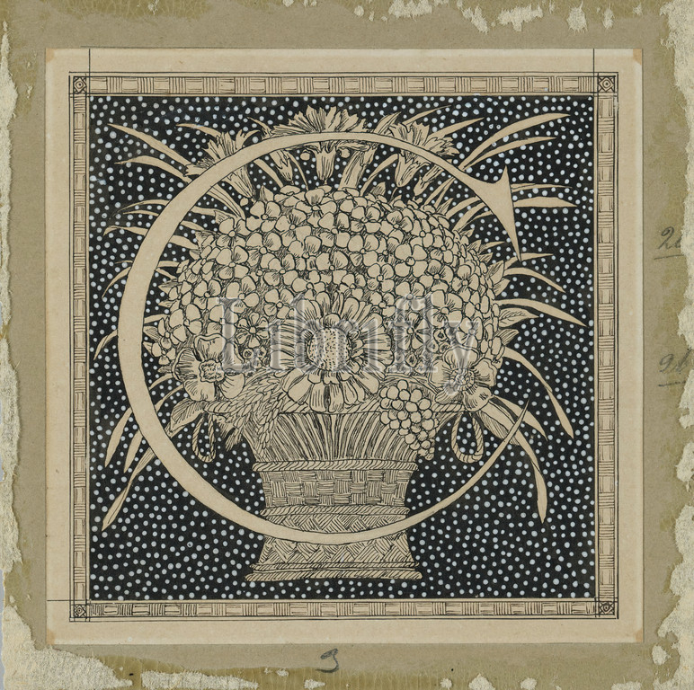 Capital Letter C, The Life of Our Lord Jesus Christ, La Vie de Notre-Seigneur Jésus-Christ, James Tissot, French, 1836-1902, Ink on paper mounted on board, France, 1886-1894, Sheet: 4 5/8 x 4 7/16 in., 11.7 x 11.3 cm, alphabet, basket, C, drawing, flowers, IMLS, letter, Tissot