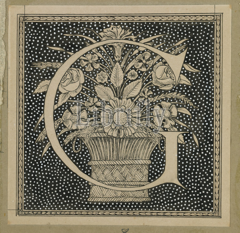 Capital Letter G, The Life of Our Lord Jesus Christ, La Vie de Notre-Seigneur Jésus-Christ, James Tissot, French, 1836-1902, Ink on paper mounted on board, France, 1886-1894, Sheet: 4 5/8 x 4 5/8 in., 11.7 x 11.7 cm, 19th Century, basket, drawing, flowers, G, IMLS, James Tissot, Letter, Tissot