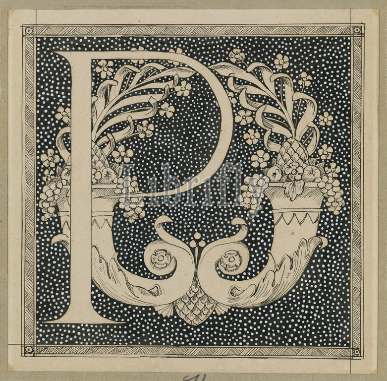 Capital Letter P, Life, Our Lord Jesus Christ, La Vie de Notre-Seigneur Jésus-Christ, James Tissot, French, 1836-1902, Ink, paper mounted, board, France, 1886-1894, Sheet, 4 1/2 x 4 5/8, 11.5 x 11.8 cm, Cornocopia, drawing, flowers, fruits, vegtables, graphic, horn, IMLS, initial, Letter, P, Tissot, writing