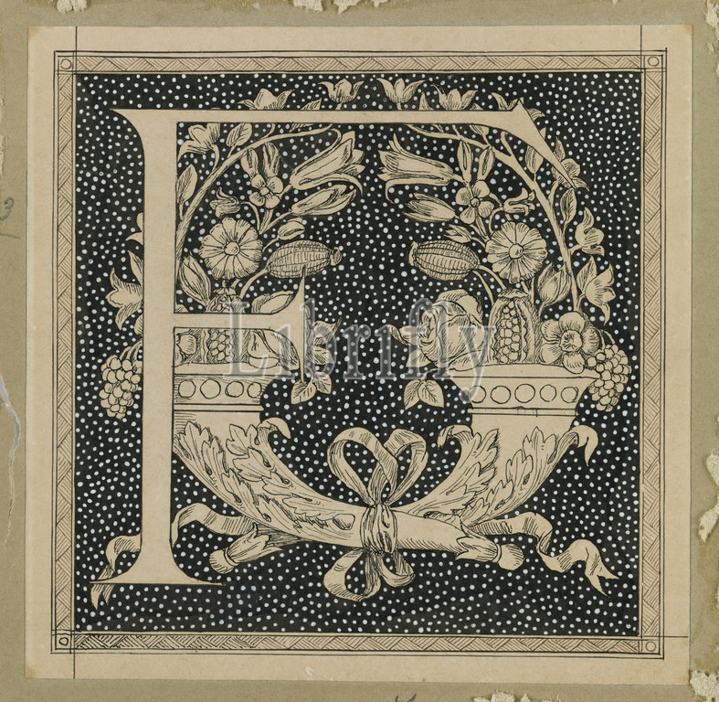 Capital Letter F, Life, Our Lord Jesus Christ, La Vie de Notre-Seigneur Jésus-Christ, James Tissot, French, 1836-1902, Ink, paper mounted, board, France, 1886-1894, Sheet, 4 3/8 x 4 5/8, 11.1 x 11.8 cm, alphabet, cornacopia, cornucopia, dots, drawing, F, Flowers, fruits, vegtables, horn, horn, plenty, horns, IMLS, initial, Letter, Tissot