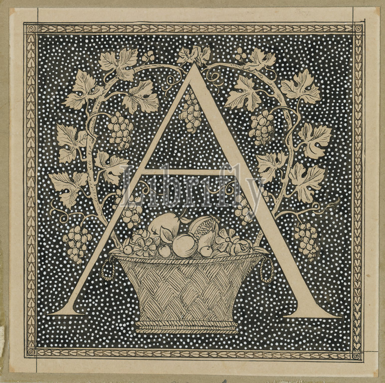 Capital Letter A, The Life of Our Lord Jesus Christ, La Vie de Notre-Seigneur Jésus-Christ, James Tissot, French, 1836-1902, Ink on paper mounted on board, France, 1886-1894, Sheet: 4 9/16 x 4 9/16 in., 11.6 x 11.6 cm, A, alphabet, basket, drawing, French, fruits and vegtables, grapes, IMLS, ink, monogram, paper, Tissot
