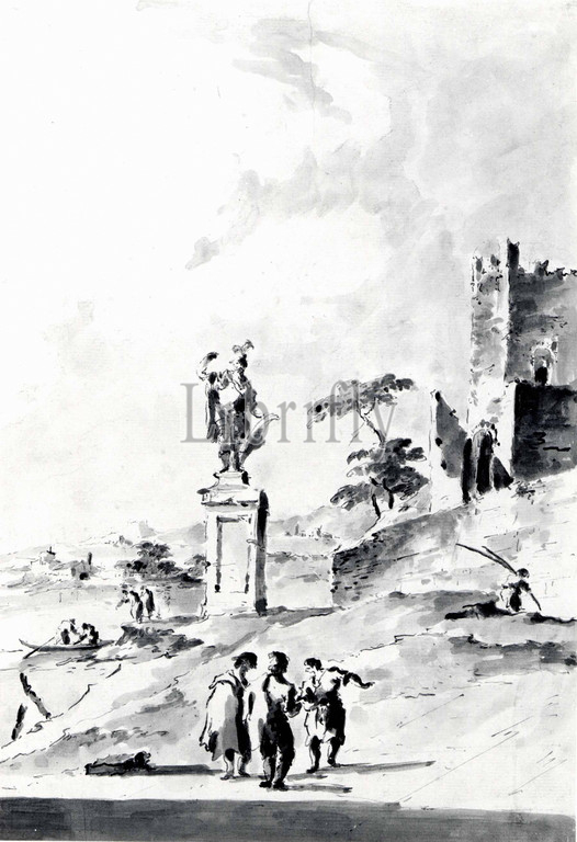 Capriccio, Statue, Warrior, Ruined Castle, Shore, Lagoon, ca, 1780–90, Pen, brown ink, gray wash, 18 9/16 x 13 11/16, 47.1 34.7 cm, Drawings, Giacomo Guardi, Italian, Venice, 1764–1835