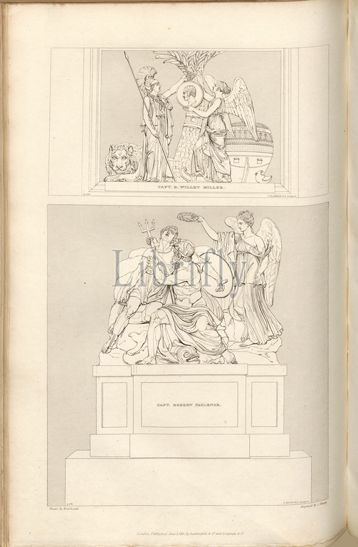 Capt. R. Faulknor and Capt. R. Willet Miller, Monuments to Captain Ralph Willett Miller and Robert Faulknor, signed: Drawn by H. Corbould; Engraved by C. Heath; Published by Lackington & Co. and Longman & Co., Pl. LIII, after p. 202, Corbould, H. (drawing); Heath, C. (engraving); Lackington & Co. (publ.); Longman & Co. (publ.), William Dugdale, Henry Ellis: The history of Saint Paul's Cathedral in London, from its foundation: extracted out of original charters, records, leiger-books, and other manuscripts. London: printed for Lackington, Hughes, Harding, Mavor, and Jones; and Longman, Hurst, Rees, Orme, and Brown, 1818
