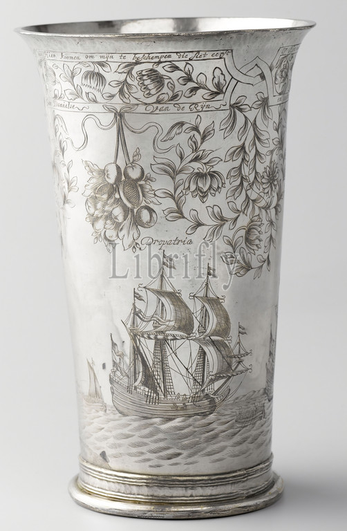 Captain Jan Danielsz van Rijn's Cup, Inverted slender conical cup, decoration, flower, leaf vines, top, fruit bunches hanging, Two horizontal bands, inscription, monogram, underside, middle, chain strung, river, Medway, town, Siattam, Chatham, English flag flies, Three ships, De Vreede, De Funete, Propatria, second ship, English 'Unity, introduced, conquered, Jan van Brakel, sailing-ship, sailing-boat, ornament derived, plant forms, Raid, Rotterdam, Jan Daniels van Rijn, 1668, black-and-white, metal, engraving