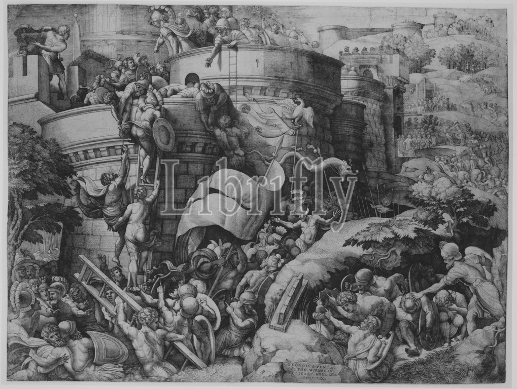 Capture, Carthagena, Scipio, Troops, 1539, Engraving, first state, seven, Hollstein, Sheet, 16 1/4, 21 5/8, 41.3, 55 cm, Prints, Georg Pencz, German, Wroclaw ca., 1500–1550, Leipzig, After Giulio Romano, Italian, Rome, 1499?–1546, Mantua
