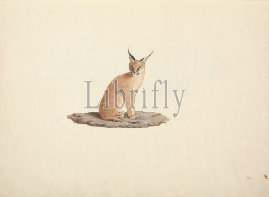 Caracal caracal (desert lynx), Luigi Balugani, 1737–1770, Italian, undated, Watercolor, gouache, and graphite on medium, slightly textured, cream laid paper, Binding: 16 inches (40.6 cm) and Sheet: 15 7/8 × 12 inches (40.3 × 30.5 cm), animal art