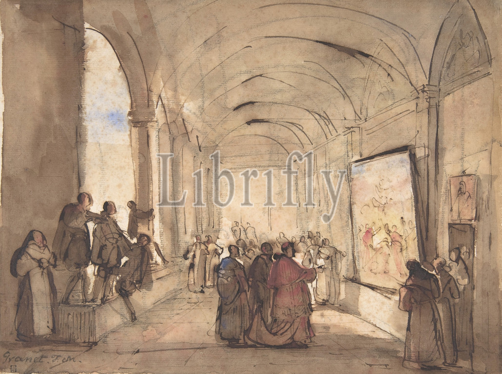 Cardinal Examining, Painting, Cloister, first half 19th century, Pen, brown ink, brush, wash, watercolor, black chalk, 7 11/16 x 10 1/4, 19.5 26 cm, Drawings, François Marius Granet, French, Aix-en-Provence, 1775–1849