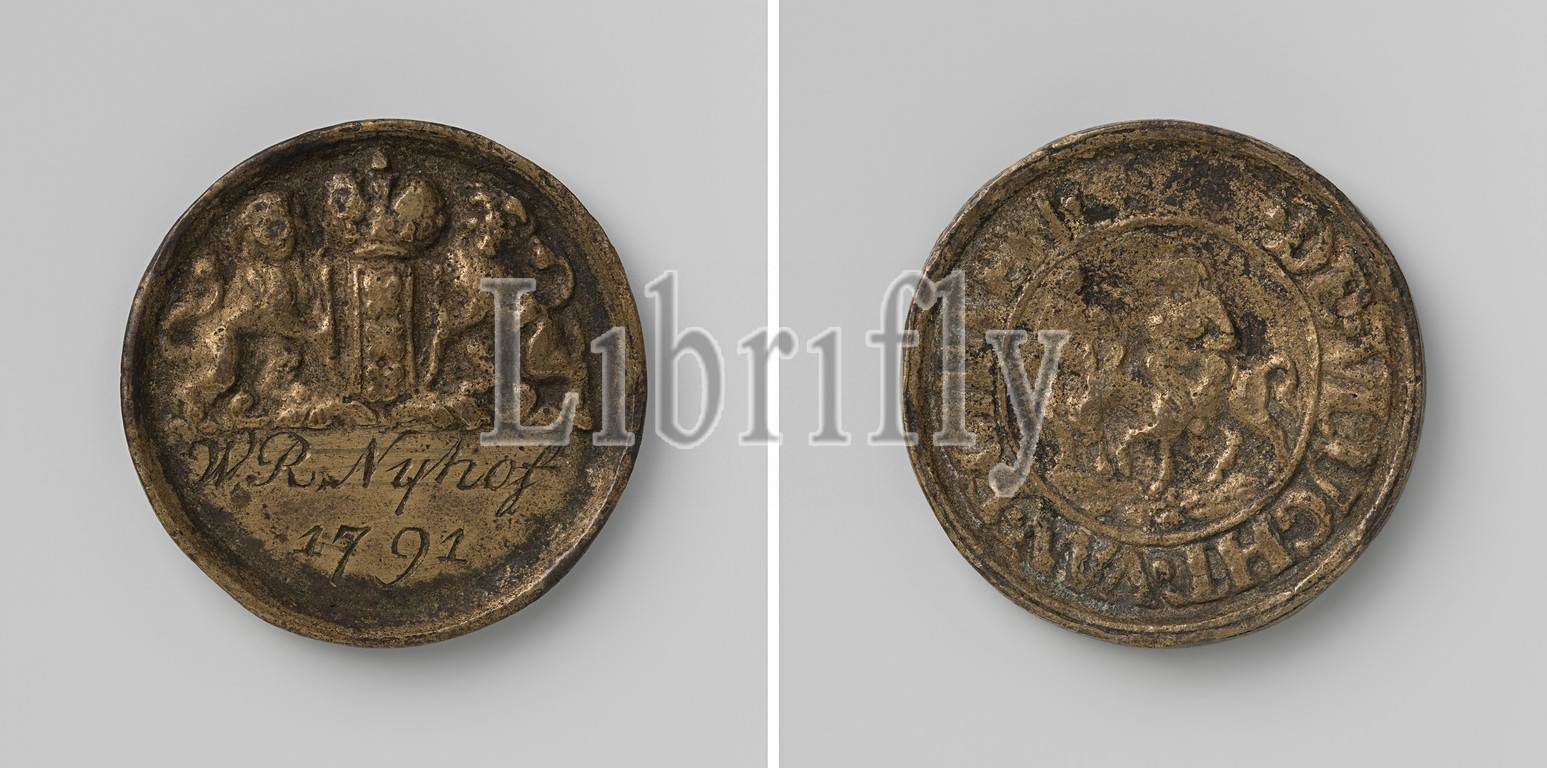 Carpenters Guild of Amsterdam, Guild Medal of W.R. Nijhof, Brass Medal. Obverse: crowned coat of arms, flanked by two lions, cut off: inscription. Reverse: Maria, sitting with a child on a donkey, who is led by Joseph within the circumscription, Amsterdam, W.R. Nijhof, anonymous, 1791, brass (alloy), engraving, d 3 cm × w 168 gr
