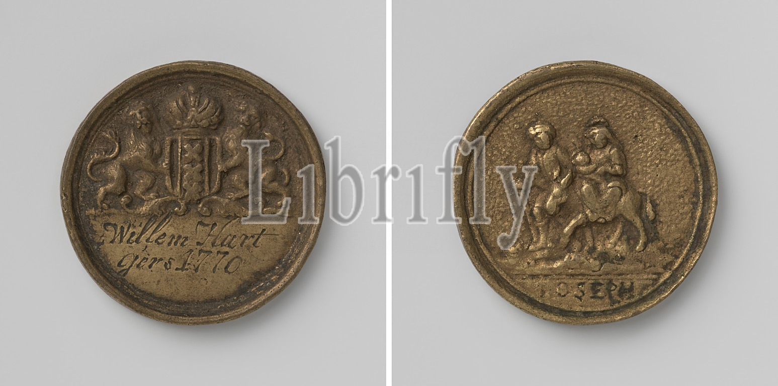 Carpenters Guild, Amsterdam, Guild Medal, Willem Hartgers, Brass Medal, Obverse, crowned coat, arms, flanked, two lions, cut off, inscription, Reverse, Mary, sitting, child, donkey, led, Joseph, 1770, brass, alloy, engraving
