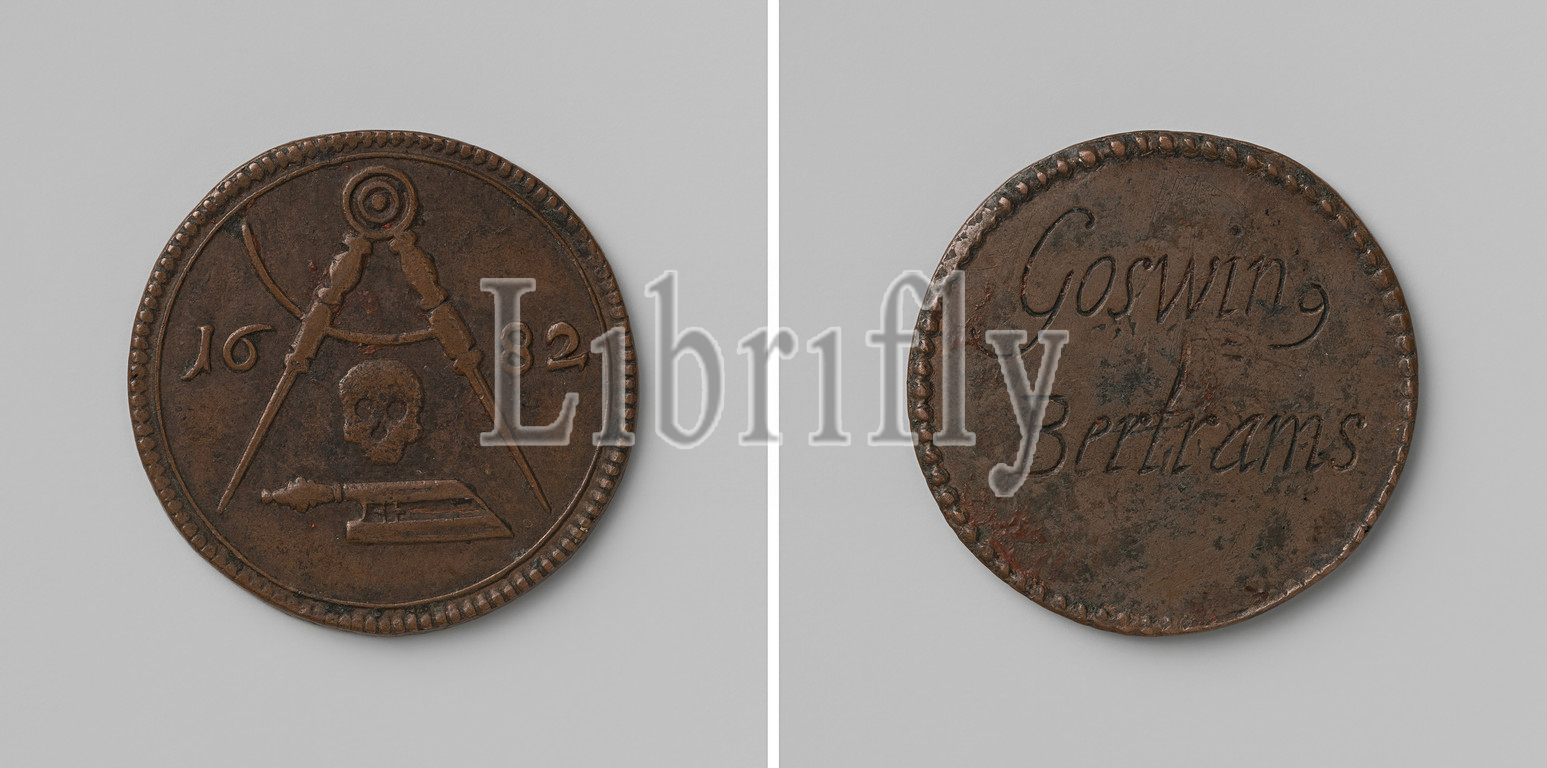 Carpenters Guild of Cologne, funeral token of Goswin Bertrams, Copper Medal. Front: open compass between year, between legs: skull above the hatchet. Reverse: inscription, Cologne, Goswin Bertrams, anonymous, Keulen, 1682, copper (metal), engraving, d 2.6 cm × w 6.24 gr