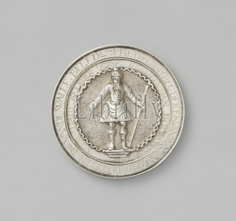 Carpenters Guild of Middelburg, Silver Medal. Front: St. Joseph with turban on head, standing on pedestal, in open hand an open compass, in left hand a measuring stick within decorative border and two-line circumference. Reverse: drill, ax, square, saw, plumb bob, caliper and hammer within decorative edge and two-line circumference, lace writing, Middelburg, Henry Somer Tulleken, Pieter Penny, Andries van Loo, Dl. van de Walle, Lourents van der Stel, Cornelis Gyse, Jan de Munck, Ary Willemsen Lou, anonymous, 1738, silver (metal), engraving, d 5.7 cm × w 38.25 gr