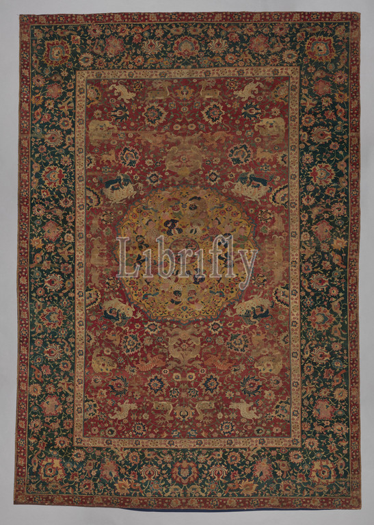 Carpet, second half 16th century, Iran, Silk, warp, cotton, weft, wool, pile, asymmetrically knotted pile, Rug, H, 99 3/4, 253.4 cm, Textiles-Rugs, scenes, depicted, carpet, allude, bazm, feast, followed, battle, Iranian history, literature, central medallion, group, beardless seated, men, drinking, talking, playing music, four standing, figures, hold, goats, perhaps, anticipation, banquet