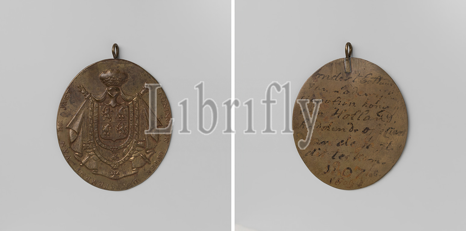 Carrying sign, royal hunting department, Oval brass carrying sign, eyelet, crowned arm, Louis Napoleon, drapery, imperial cloak, sword, France's marshal, side, Around, chains belonging, grand crosses, Ordre Royal de Hollande, Legion, Honor, reverse, handwriting text, Netherlands, Lodewijk Napoleon Bonaparte, 1807, brass, alloy, engraving