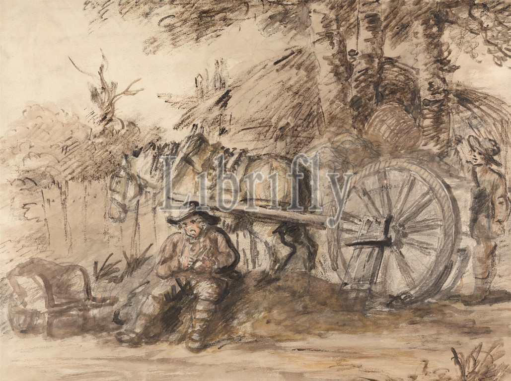 Carter Filling his Pipe, Henry William Bunbury, 1750–1811, British, undated, Watercolor and crayon on medium, slightly textured, cream wove paper, Sheet: 11 1/2 × 15 1/4 inches (29.2 × 38.7 cm), animal art, cart, genre subject, horse (animal), pipe, trees, wheel