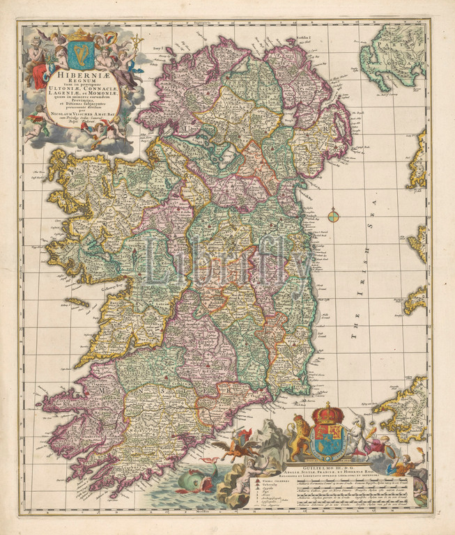 Cartography, Netherlands, map, Ireland, Map, areas colored, Inscription surrounded, allegorical figures, putti, crowned coat, arms, R m, wind rose, r o, commissioned, William III, crowned weapon, flanked, lion, unicorn, legend, scale, German, French, English, Spanish miles, surrounded, extensive allegorical print, 1, 900 000, Signed, lb, NICOLAUM VISSCHER AMST, BAT, cum Privileg, Ordin, General, Belgii Foederati, Nicolaes Visscher, I, Amsterdam, 1650, 1700, paper, engraving