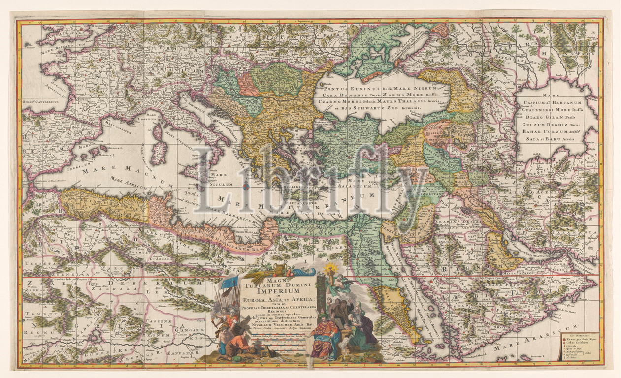 Cartography, Netherlands, map, Mediterranean, parts, Europe, N, Africa, Middle East, Turkish Empire, Map, areas colored, trees, mountains, buildings inscribed, bordered, yellow, Wind rose m, M o, inscription martial, allegorical scene, regard, Turkish sultan, R, legend, Inscription, m, MAGNI, TURCARUM DOMINI, IMPERIUM, EUROPE, ASIA, ET AFRICA, etc, Signed, NICOLAUM VISSCHER Amst, Bat, Tideman f, G v, Shire, Nicolaes Visscher, I, Amsterdam, 1650, 1700, paper, engraving