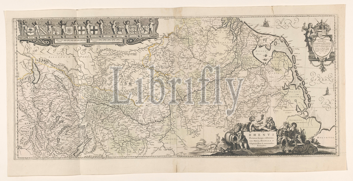 Cartography, Netherlands, map, Rhine basin, Map, Rhine region, North right, Folding map r b, dedicated, D, Andrea Bickerus, Willem Blaeu, visible scratching, plate, remove, underneath, Command coat, arms allegorical figure, r o, inscription surrounded, animals, allegorical figures, L, row, coats, arms held, putti, v l n r, Switzerland, Alsace, Paltin Rheni, Archdiocese, Mogun, Trier, Cologne, Kleve, Gelderland, Utrecht, Holland, Scale French, German miles, Willem Janszoon Blaeu, Amsterdam, 1636, paper, engraving